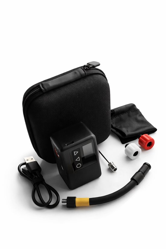 Altijd de juiste bandenspanning binnen handbereik. Deze draadloze elektrische mini pomp is compact, krachtig en wordt geleverd als complete bundel met een waterafstotend/ schokbestendig hoesje en accessoires. Ideaal voor fiets, e-bike, scooter en motor en perfect om mee te nemen in je tas of zelfs je broekzak.